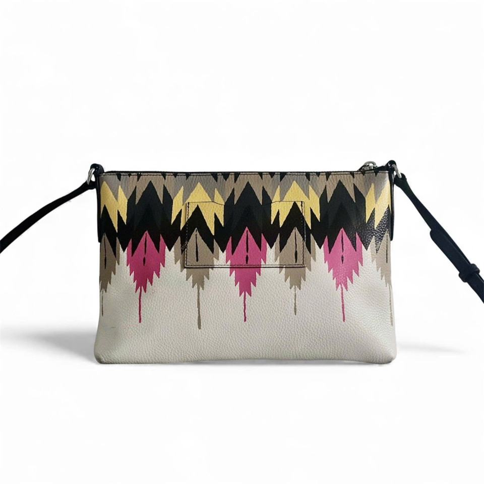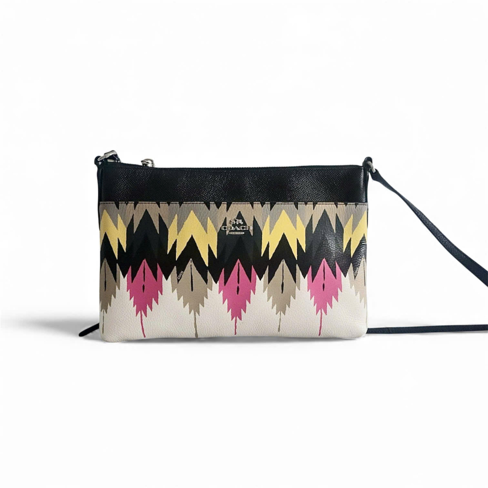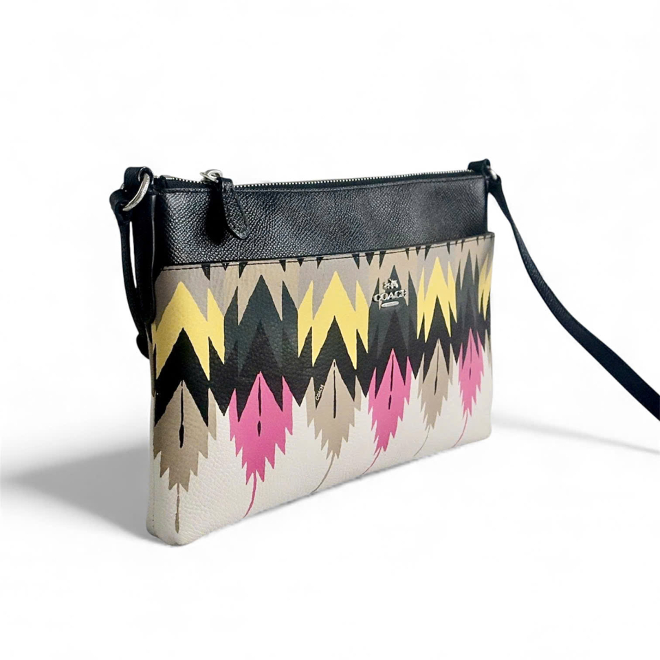 Thiết kế: Phối nhiều màu với hoạ tiết lông vũ màu đen, be, vàng, hồng, túi có quai dài phù hợp đeo vai hoặc đeo chéo
