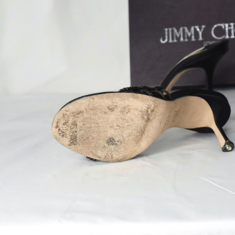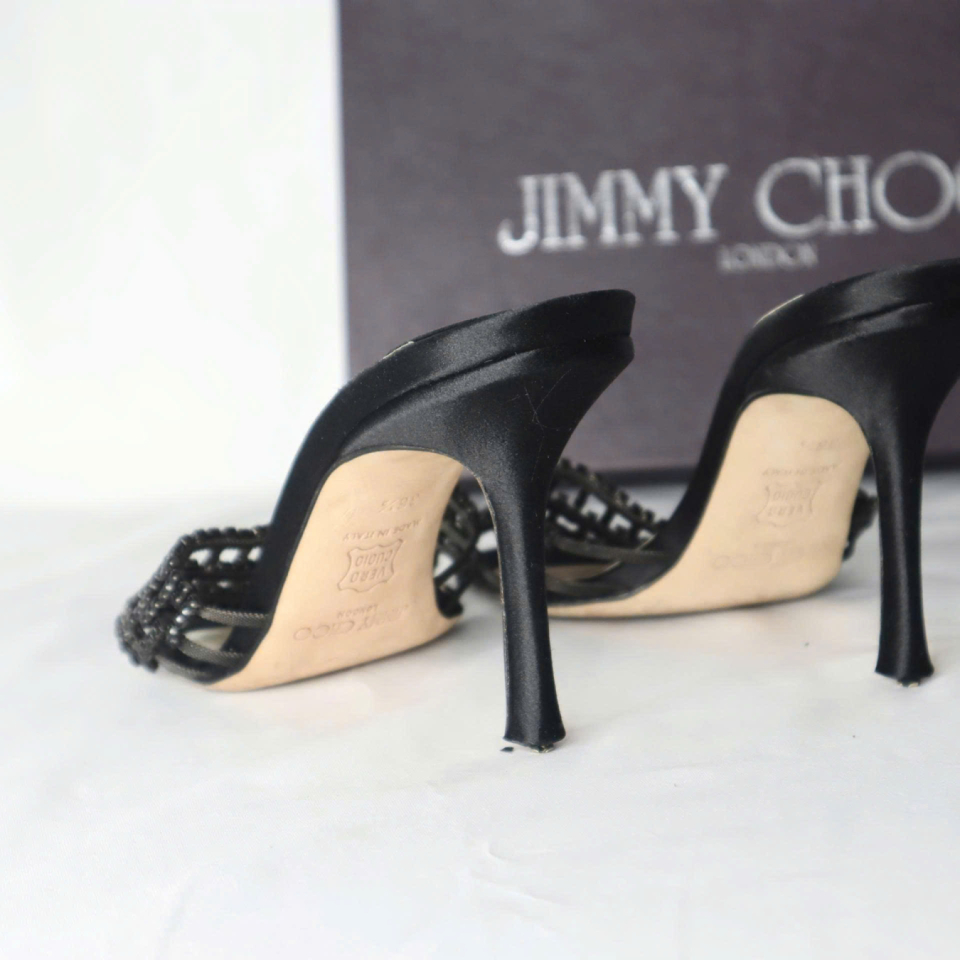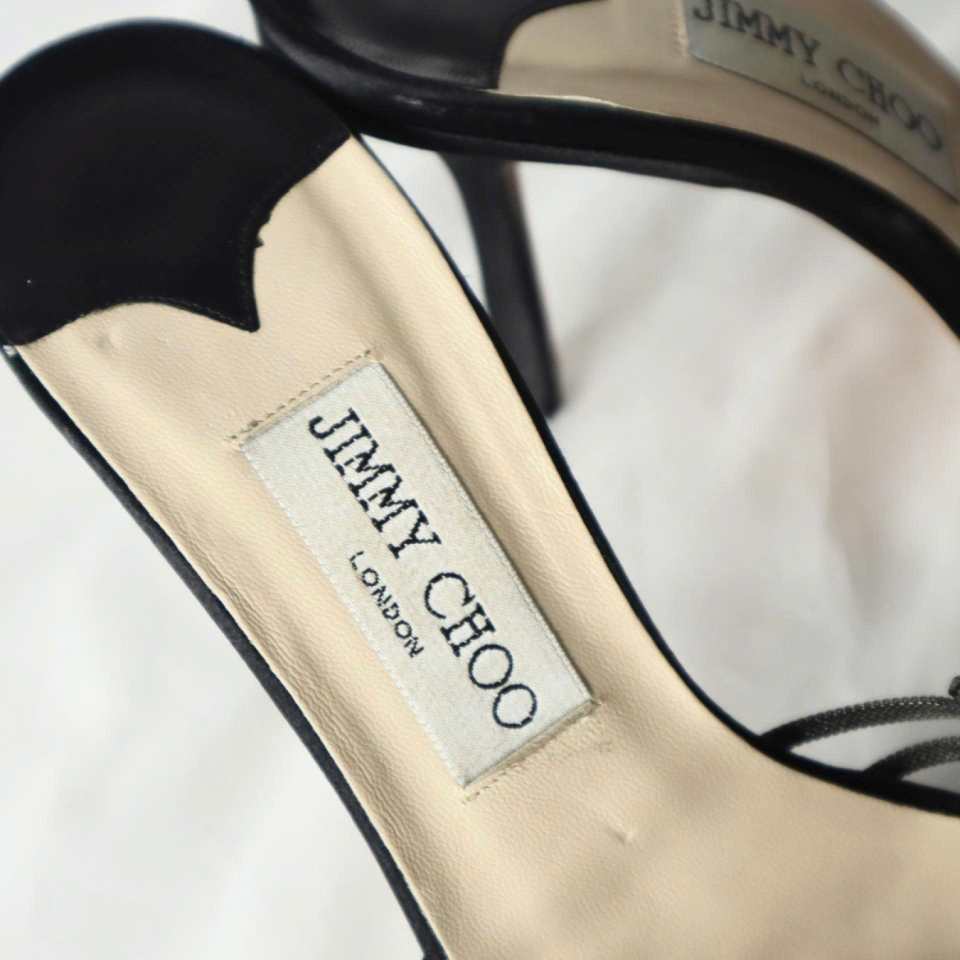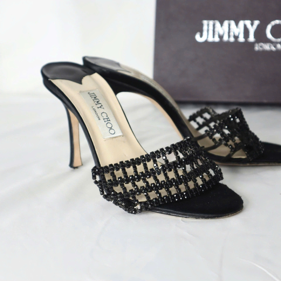 Kiểu dáng: Sandal cao gót hở mũi, quai ngang và quai cổ chân đính pha lê màu đen sang trọng. Gót giày nhọn thanh mảnh (stiletto heel).