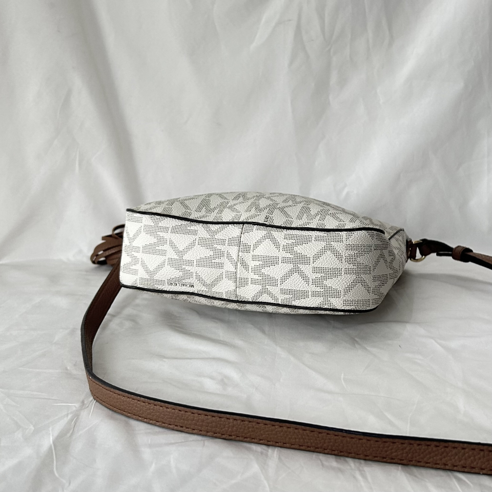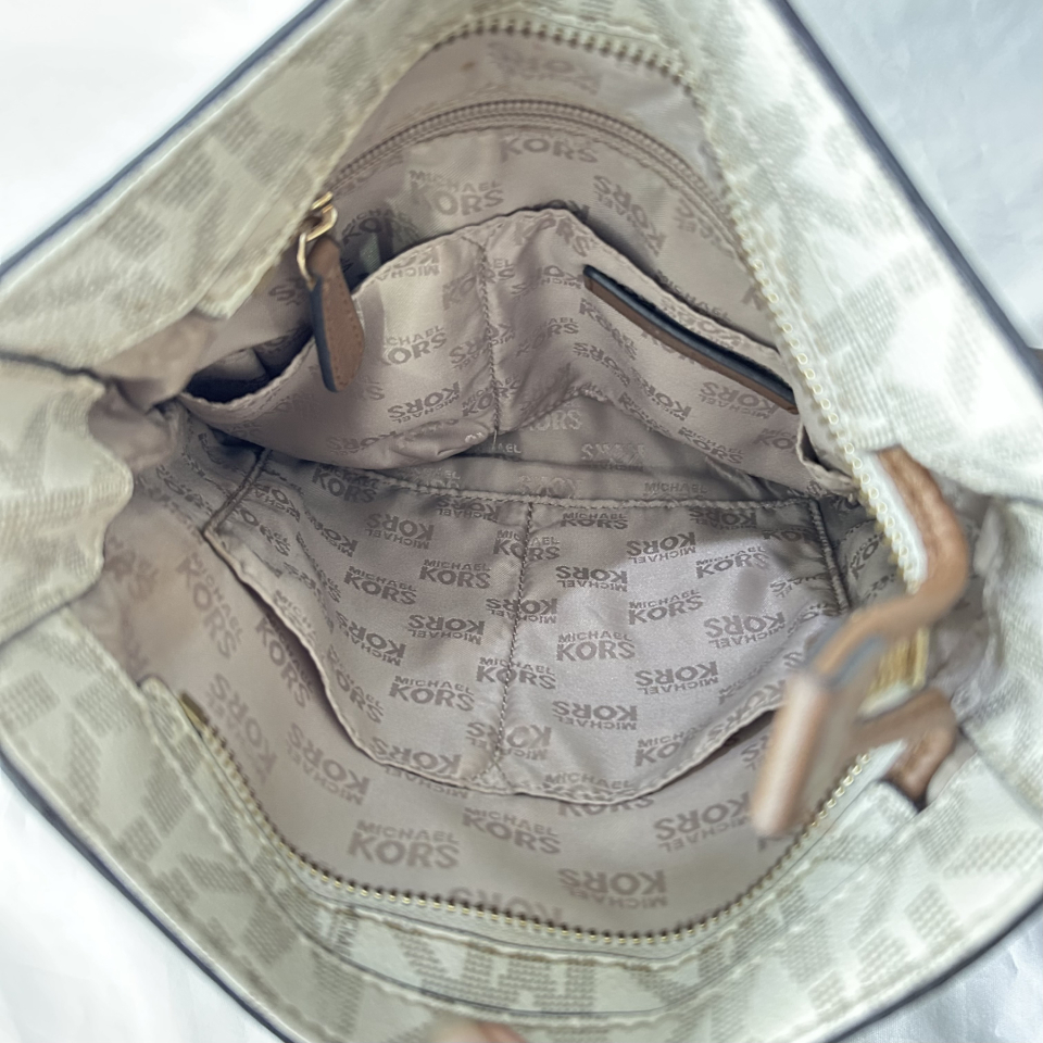 Thiết kế: Thân túi làm từ canvas in logo chữ ký MK, kết hợp với dây đeo bằng da Saffiano cao cấp.