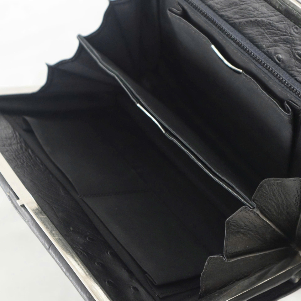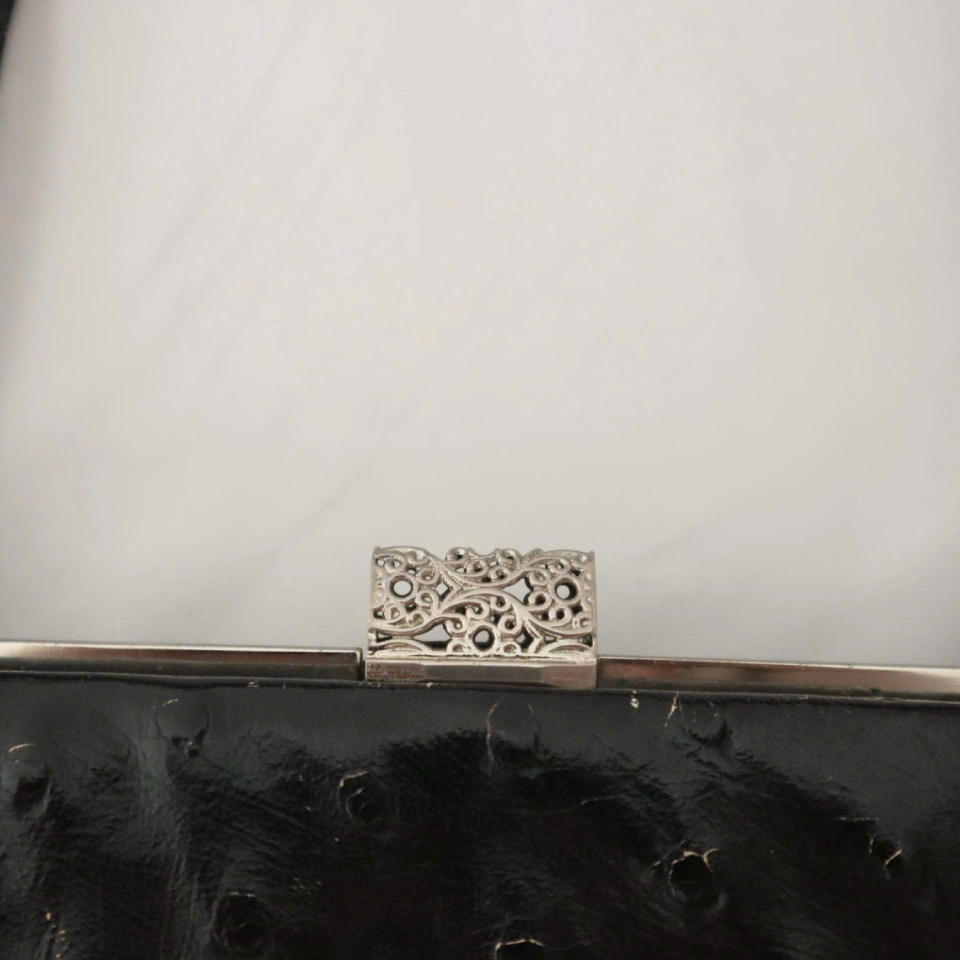 Thiết kế: Túi kiểu dáng cổ điển, phom hộp cứng cáp, làm từ da đà điểu màu đen nổi bật với các nốt sần đặc trưng. Túi có quai xách đôi và điểm nhấn khóa gài kim loại màu bạc.